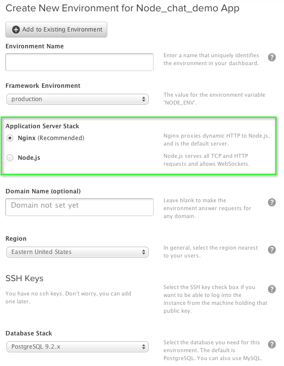 The environment page options also change based on your language selection. For example, if you chose Node.js: