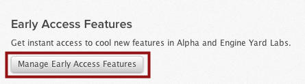 Getting access to Alpha features and Engine Yard Labs features is now faster and easier. If you have a full Engine Yard account, you can get instant access to Early Access features from your Account Settings page.