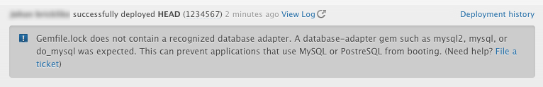 If your application is missing a database-adapter gem or the Gemfile.lock, you now see a warning message on the Environment page of the Dashboard (in addition to the deployment log).