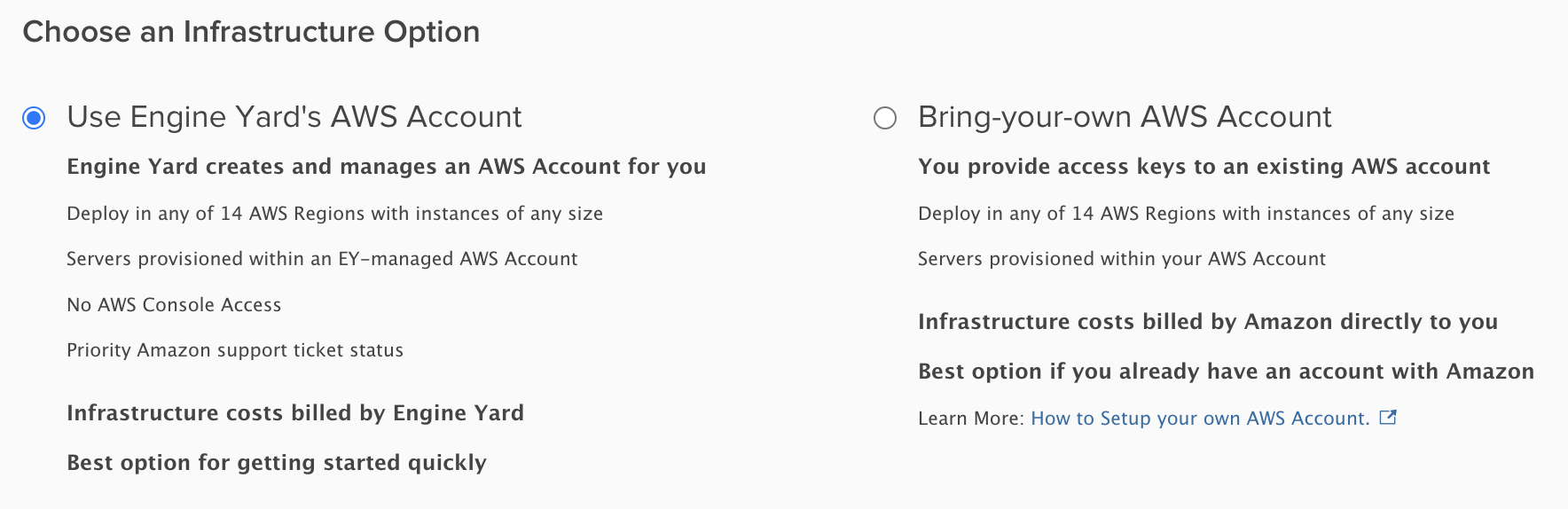 Choose Use Engine Yard's AWS Account to be allocated a new, private, AWS account from Engine Yard's reserved pool and pay for infrastructure as part of your EY bill, or Bring-your-own AWS Account in order to utilise your own pre-existing AWS account with your EY account and continue to pay AWS directly for infrastructure.