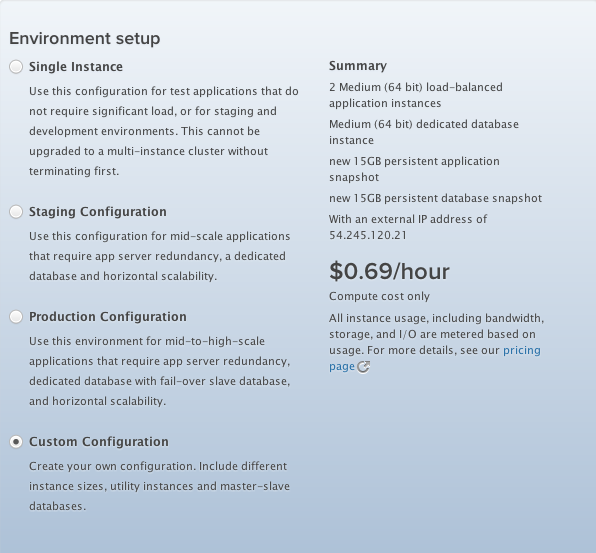 The staging and production config options provide you with a pre-configured environment, or you can choose custom configuration to have fine-grained control over the instances in your environment.