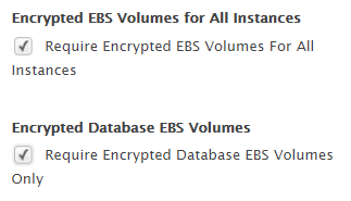Note: As existing instances cannot be encrypted, the ability to enable encryption on a running environment is disabled. If you require to enable encryption on an existing environment either terminate the environment, enable the setting and boot the environment again, or contact Support in order that they can enable the setting on the live environment and guide you through the process of cycling the existing instances.