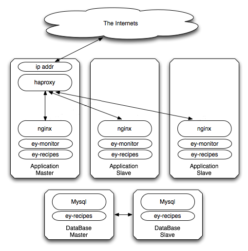 • Database Slaves: If there is only a single database slave it will be mapped to ey-db-slave. If there are multiple database slaves they will have an index number (starting at 0) based on the order in which the hosts are listed in the DNA. If a database slave also has an assigned name (e.g. backup) it will generate a corresponding hostname for that also (e.g. ey-db-slave-backup) resulting in more than one way to reference to a single replica.