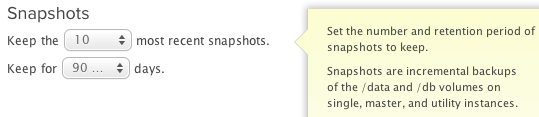 Note: This applies to each instance in an environment. For example, if you have 5 instances and set this number of snapshots to 10, then your environment will accumulate 5x10 snapshots.