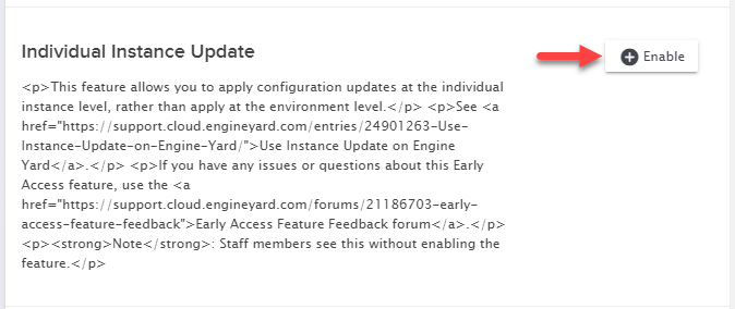 3. On the 'Manage Early Access Features' screen, next to the Individual Instance Update feature, click Enable.
