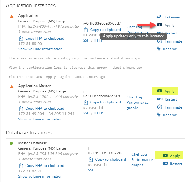 3. On the Environment page, determine which specific instance needs a Chef update. Each individual instance will now have an 'Apply' button as shown in the screenshot below.