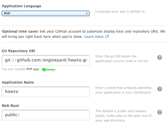 - Git Repo URI: Click to select our sample HowTo app or enter git information for your own app.