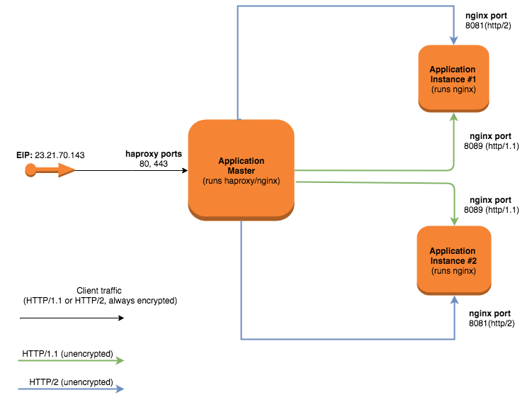 Given that DNS resolves to an EIP which is attached to application master of the environment (23.21.70.143 in the diagram below), user traffic will reach application master exclusively. Application master is responsible (by utilising haproxy) for the following: