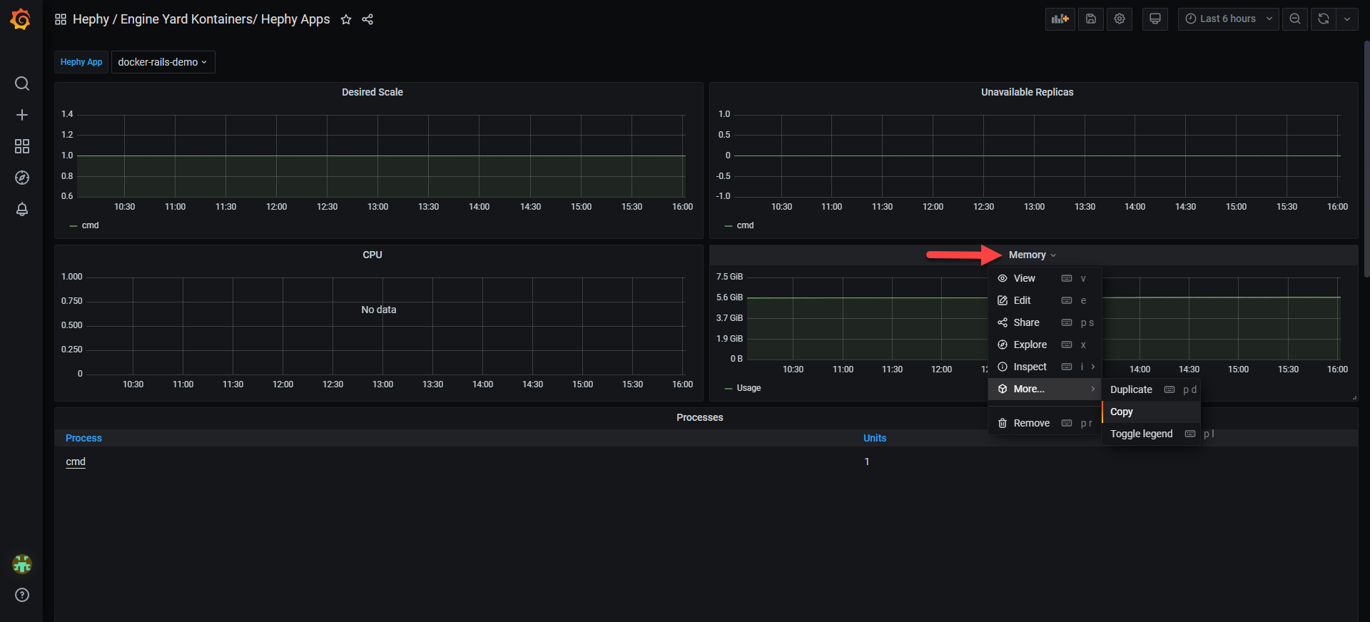 - On the Hephy / Engine Yard Kontainers / Hephy Apps dashboard click on the down arrow that shows when hovering over the Memory graph title, then More -> Copy