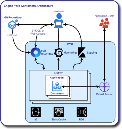 In this article, you will learn about the various components which make up Engine Yard Kontainers (EYK). This includes information on the EYK architecture and how the various components interact.