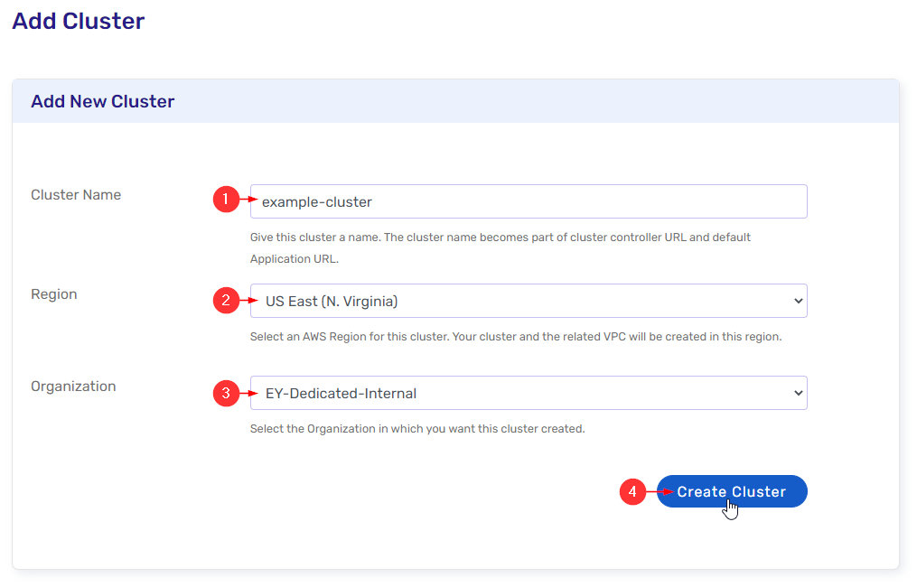 - Cluster Name: Assign a name to your cluster which will become part of the default application URL