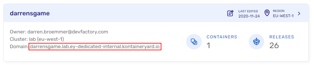 Applications that are deployed with Engine Yard Kontainers receive a default URL within EYK's domain. You can use this default URL or assign your own registered domain name as the URL for your application in the EYK Web Console. In addition, you can apply your SSL certificate to your application for increased security.