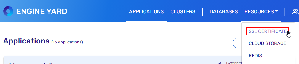 - You will arrive on the Applications page by default. At the top of the page, click the Resources drop-down and select SSL Certificate to open the SSL Certificates page