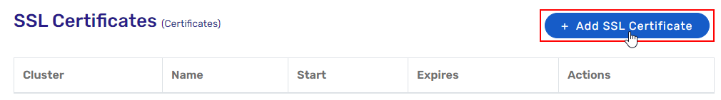 - The SSL Certificates page lists any SSL Certificates that you have loaded. To add a new Certificate, click the + Add SSL Certificate button at the top to open the Add SSL Certificate page
