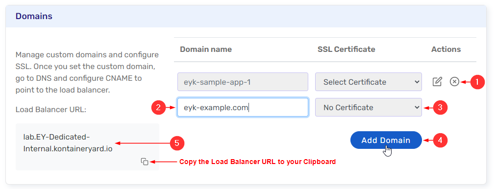 - Load Balancer URL: In order for the changes to take effect, you will need to update the CNAME of your DNS record to point to the EYK load balancer shown in your Domains card