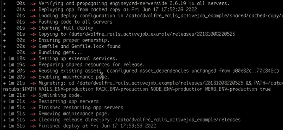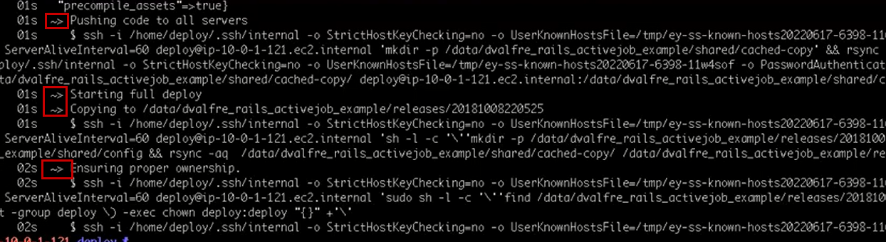 less [app_name]-integrate-ip-[ip].ec2.internal.log. In this log, the symbol ~> is included before each stage of the process.